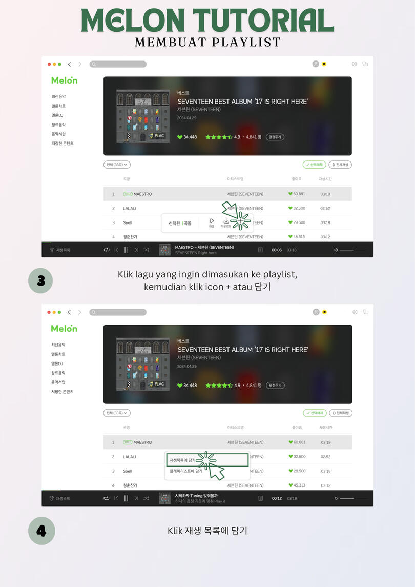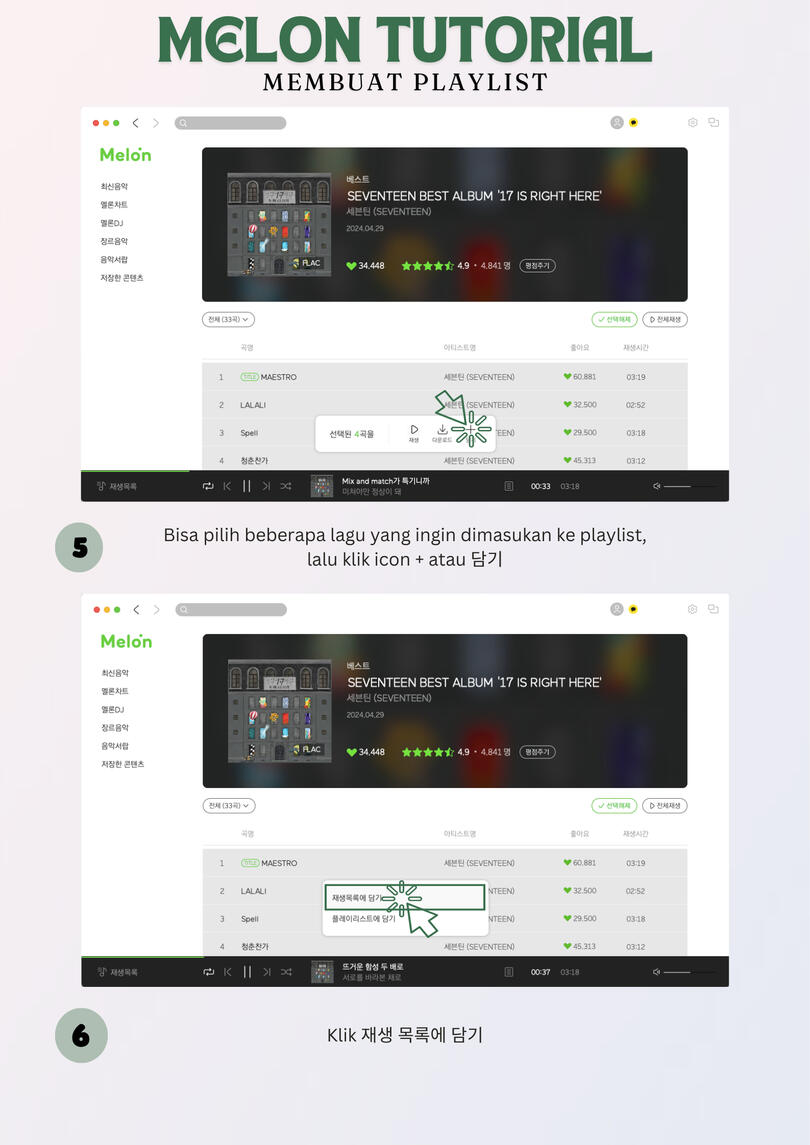 5. Bisa pilih beberapa lagu yang ingin dimasukan ke playlist, lalu klik icon + atau 담기